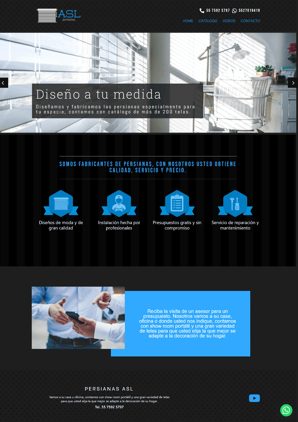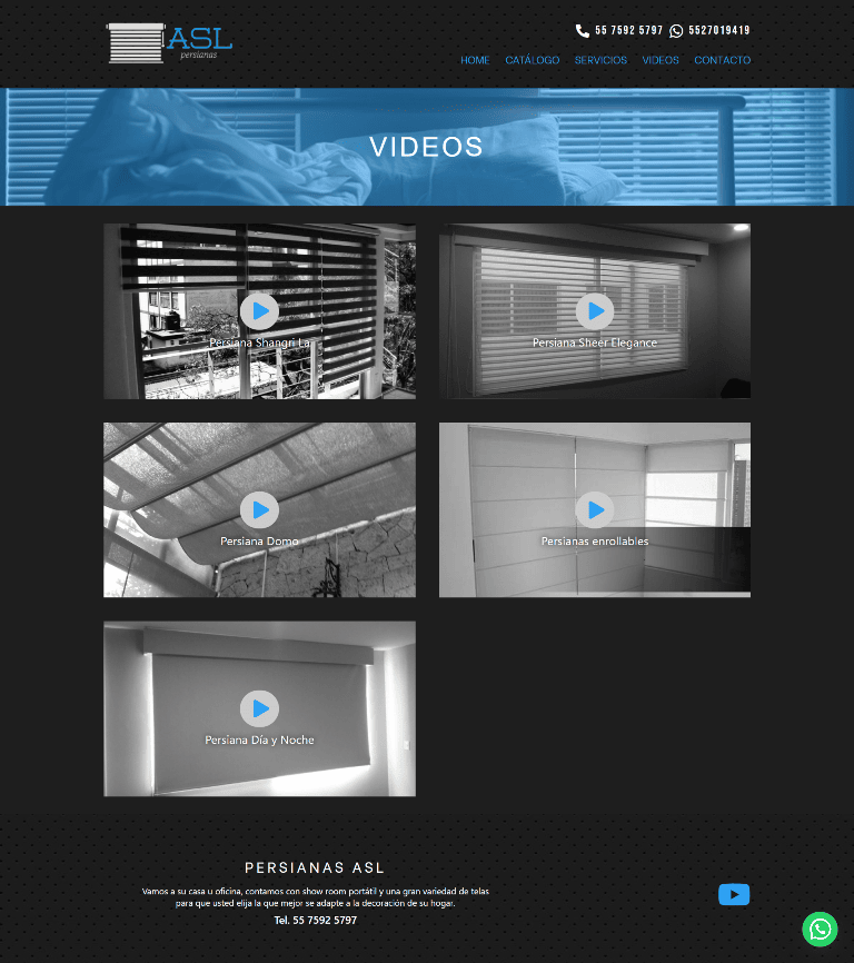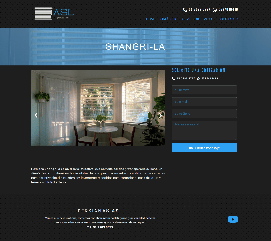 Se realizó el diseño de un sitio Web que incluyera un catálogo de persianas donde se puede solicitar más información o una cotización mediante un formulario de contacto, Persianas ASL es fabricante así que se buscó destacar con imágenes y videos el desarrollo de su actividad.